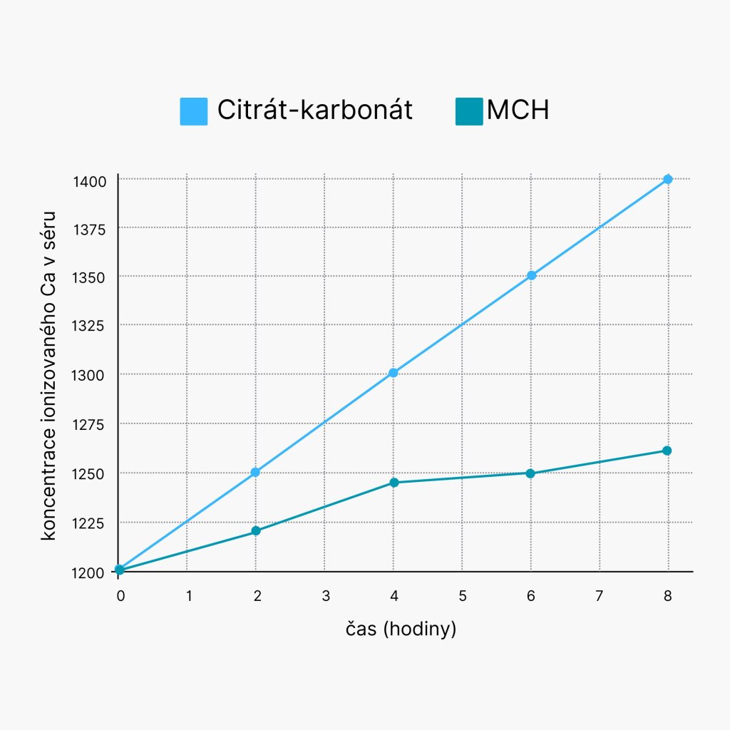 Studie z roku 2014 ukazuje rozdíly formami vápníku (citrát, MCH) a jejich vliv na koncentraci vápníku v krvi během 8 hodin. Ukázalo se, že MCH-Cal™ má menší dopad na zvýšení hladiny ionizovaného vápníku v krvi ve srovnání s běžným citrátem, což je velmi pozitivní výsledek, protože vysoké hladiny vápníku v krvi mohou být spojeny s vyšším kardiovaskulárním rizikem. MCH-Cal™ tedy poskytuje vápník, aniž by zbytečně zvyšoval hladinu vápníku v séru, což je bezpečnější pro dlouhodobé užívání.1