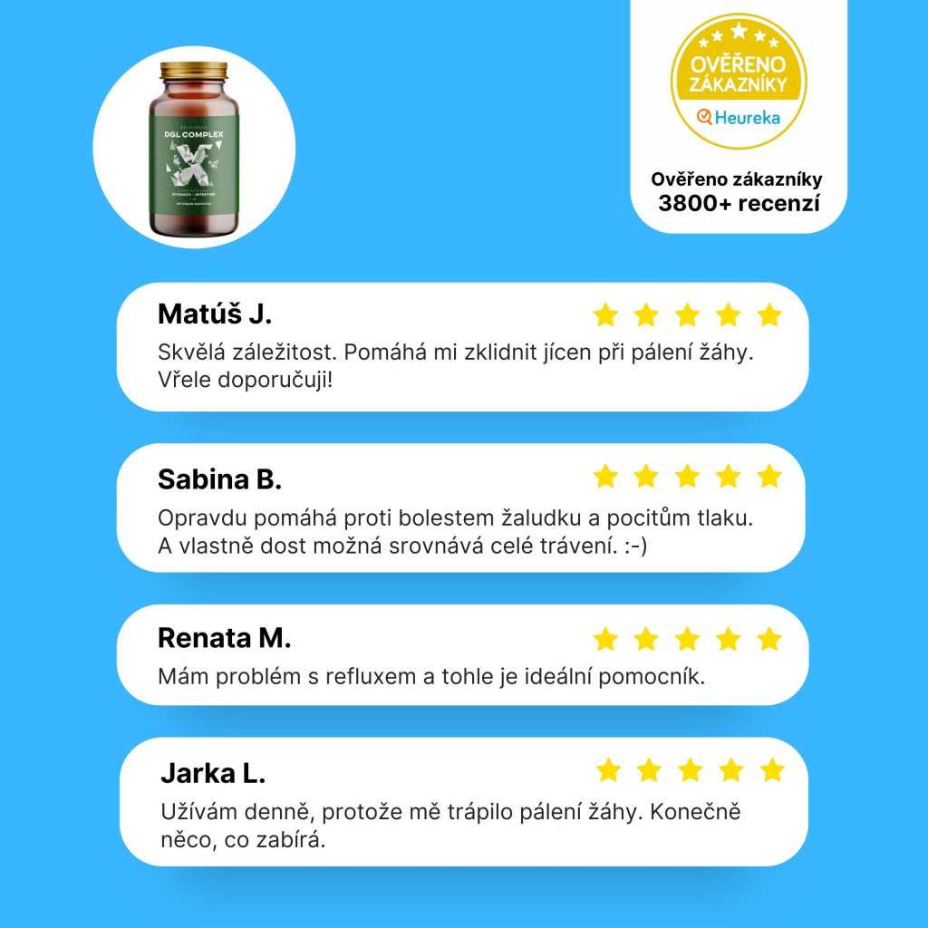 Desítky studií a stovky let zkušeností potvrzují významnou roli lékořice při podpoře zdraví trávicího traktu. DGL neboli deglycyrrhizinovaná lékořice je speciálně upravenou formou kořene lékořice, u které byl odstraněn zdraví škodlivý saponin glycyrrhizin. Takto upravená lékořice je velmi potentní při podpoře zdraví žaludeční a střevní výstelky. Pro ještě hojivější účinek na trávicí trakt byl k DGL přidán koncentrát organického Aloe Vera. Produkt neobsahuje žádné balastní látky a příměsi a je vhodný i pro vegany.