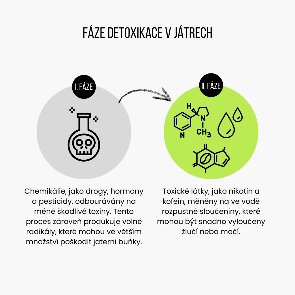 V 1. fázi detoxikace játra odbourávají chemikálie, jako drogy, hormony a pesticidy, na méně škodlivé toxiny, což produkuje volné radikály, které mohou poškodit jaterní buňky. V 2. fázi se toxiny, jako nikotin a kofein, mění na ve vodě rozpustné sloučeniny, které tělo snadno vyloučí žlučí nebo močí. Během této fáze játra opět produkují volné radikály, což může vést k poškození jaterních buněk.
