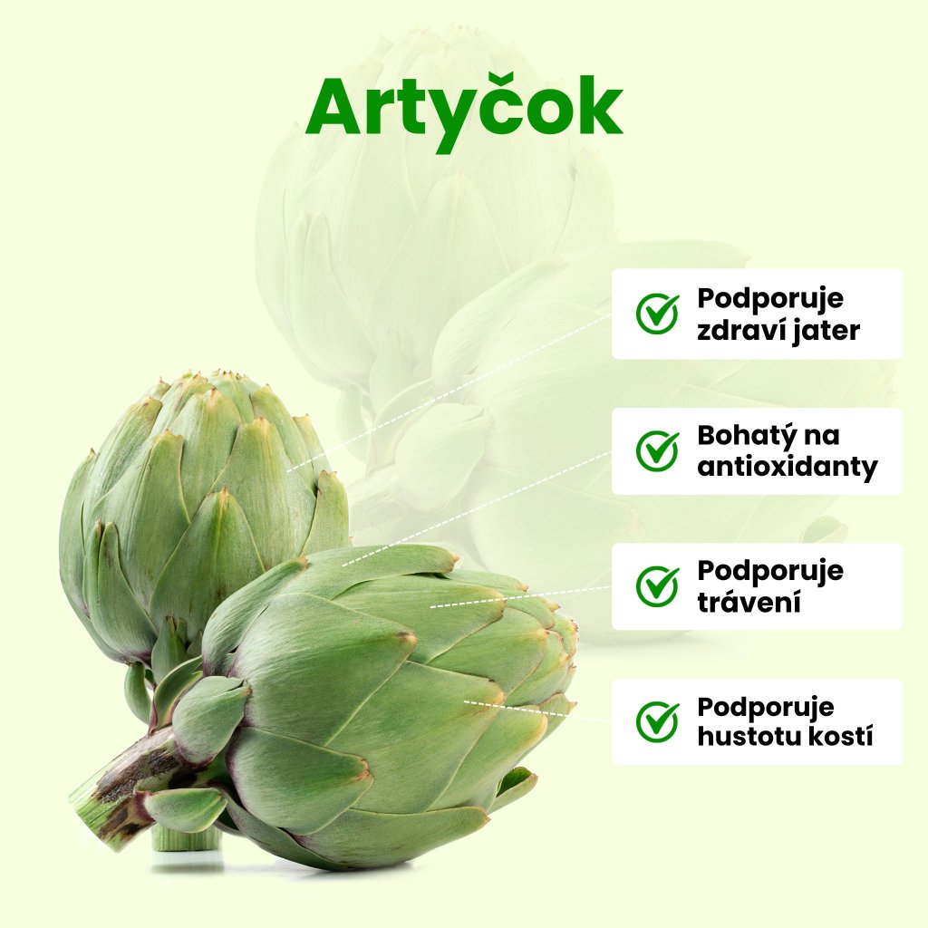 Artyčok je bohatý na látky podporující zdraví jater, jako jsou cinarin a chlorogenová kyselina. Díky tomu artyčok podporuje trávení a detoxikaci těla. Extrakt z artyčoku obsahuje látky, které stimulují tvorbu žluče, což může pomoci při rozkladu těžkých tuků a detoxikaci jater. Jeho bohatý obsah antioxidantů pomáhá chránit buňky před poškozením volnými radikály, čímž podporuje celkové zdraví a odolnost organismu.