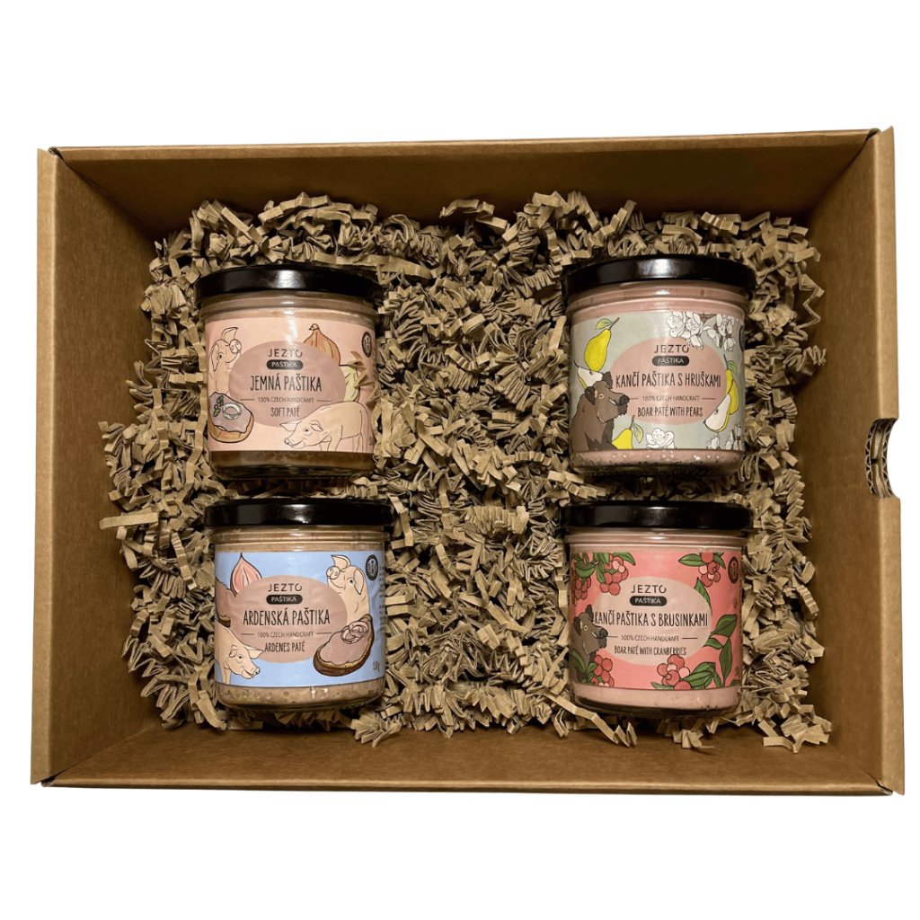 Dárkové balení plné chutných poctivých paštik potěší každý mlsný jazýček. Balíček lze doplnit jakoukoliv pozorností z naší nabídky (např. srdíčko, prasátko atd.). Součástí balení je krásná stylová krabička JEZTO.